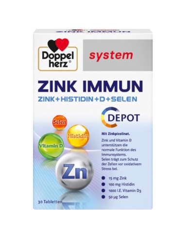Doppelherz® system Cink Immun DEPO sadrži 50 μg selena, 25 μg vitamina D, 15 mg cinka i 100 mg L-histidina.