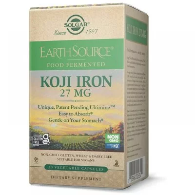 Solgar Earth Source Koji Iron 27 mg je novo, potpuno drugačije željezo — jedinstven oblik željeza s produljenim otpuštanjem dobiven tehnologijom Ultimine koja je u postupku patentiranja, a koja koristi Koji fermentaciju za dobivanje visoko kvalitetnih minerala.